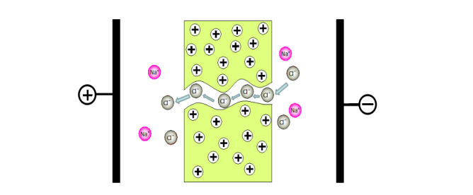 均相陰離子交換膜,屬電驅(qū)動膜,離子電遷移膜的一種,是聚乙烯接枝聚苯乙烯季銨型強堿性陰離子交換膜,在外加直流電場力的作用下,可選擇性地讓溶液中的陰離子通過并阻擋住陽離子,如圖所示: