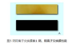 陽膜為苯乙烯系磺酸型均相陽離子交換膜(JCM-Ⅱ)(圖5A下);陰膜為苯乙烯季銨型均相陰離子交換膜(JAM-Ⅱ) (圖5A上);我公司自主研發(fā)生產(chǎn)。在外加直流電場(chǎng)力的作用下,陰膜只讓陰離子通過而阻擋陽離子,陽膜只讓陽離子通過而阻擋陰離子,它們具有耐強(qiáng)酸、強(qiáng)堿,柔韌度強(qiáng),機(jī)械強(qiáng)度高,使用壽命長(zhǎng)等特點(diǎn)。各膜性能指標(biāo)如下: